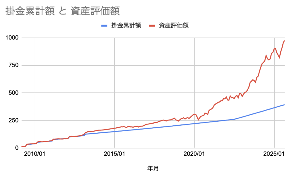 上のグラフをもう一度見ていただくとわかるように、最初は大して増えません。しかし時間が経つとどんどん増えていくものなのです。よく複利効果と呼ばれるものです。できるだけ時間をかけて淡々と続けることが本当に大事だと思います。